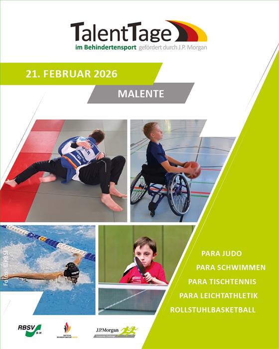 Datum: 09.01.26 Verfasser: Oliver ZummachLiebe Verbands-/Vereinsvorstände, liebe Trainerinnen und Trainer, liebe Sportlerinnen und Sportler,wir wünschen allen einen guten Start ins Jahr 2026 und hoffen, dass wir gemeinsam Viele und Vieles bewegen können.Beginnen wollen wir 2026 unter anderem mit dem Para Nachwuchssport!Am 21.02.2026 findet von 10-15h in Malente wieder ein TalentTag statt.Wir suchen junge Menschen mit Beeinträchtigung die Lust auf Nachwuchs- und Wettkampfsport in den SportartenPara Judo, ID Judo,Para Leichtathletik,Para Schwimmen,Rollstuhlbasketball undPara Tischtennis haben.Der TalentTag bietet jungen Menschen den Einstieg in den Behindertensport. Diejenigen, die bisher noch keinen Kontakt zum organisierten Sport hatten, können erste Erfahrungen und Eindrücke sammeln.Sportlerinnen und Sportler, die bereits in eurem Verein/Verband eine Sportart betreiben, können mit unseren erfolgreichen Parasportlerinnen und Parasportlern weitere Erfahrungen sammeln.Wer noch unsicher ist, kontaktiert uns einfach per Mail joern.wartig@rbsv-sh.de oder Telefon 04621 27689.Wir kommen auch gern einmal bei Euch vorbei, um uns und unsere Landesnachwuchs- und -leistungssportarbeit vorzustellen und erste Kontakte zu ermöglichen.Es ist uns völlig bewusst, dass gerade der Parasport von guten Kontakten zwischen Sporttreibenden und Übungsleitenden lebt! Darum gebt euren Sportlerinnen und Sportlern und uns eine Chance des Kennenlernens. Kommt zum TalentTag!Mit sportlichen Grüßen gez. Jörn Wartig(Geschäftsstelle RBSV S-H) Dateianhang: Flyer-Malente 2026 _Web.pdfDateianhang: TalentTag Malente 2026 Anmeldeformular.docx |