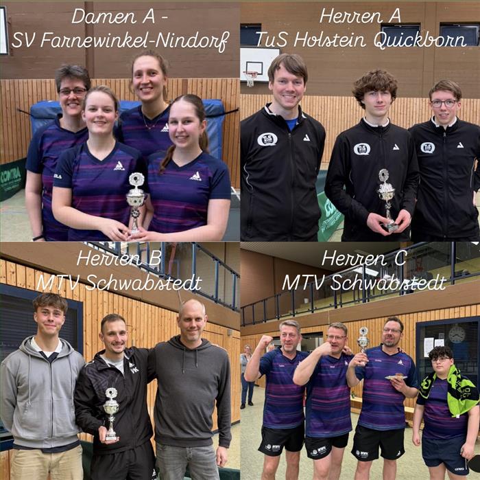Datum: 28.03.26 Verfasser: Oliver ZummachFarnewinkel-Nindorf und Quickborn jubeln in der A-Klasse – „Goldenes Double“ für SchwabstedtNiebüll - Bei den Landespokalmeisterschaften setzten sich der SV Farnewinkel-Nindorf (Damen-Landesebene), der TuS Holstein Quickborn (Erwachsenen-Landesebene) sowie der MTV Schwabstedt gleich zweimal (Erwachsenen-Bezirks- und Kreisebene) durch und lösten damit die ebenso sehr begehrten wie umkämpften Tickets für den Bundesentscheid im nordrhein-westfälischen Hamm (14.05.2026 bis zum 17.05.2026).Der TSV Rot-Weiß Niebüll um Abteilungsleiter Erk Boysen fungierte dabei in der Sporthalle II des Niebüller Schulzentrums mit viel Engagement als hervorragender Gastgeber, während Jan Aufderbeck (Jugendwart des KTTV Nordfriesland) in der Turnierleitung glänzte. Alle Beteiligten sorgten zudem unter den Augen des TTVSH-Verantwortlichen für diese Veranstaltung, Andreas Müller (Beisitzer im TTVSH-Sportausschuss), dafür, dass der erfahrene Oberschiedsrichter Hauke Bohnert kaum aktiv werden musste.Herzlichen Glückwunsch an alle Aktiven zu ihren Leistungen und Ergebnissen sowie herzlichen Dank an Ausrichter, Durchführer, Oberschiedsrichter und Turnierleitung.Alle Ergebnisse sind im TT-TurnierCenter einsehbar.Das Präsidium und der Sportausschuss des TTVSH wünschen den Vertretenden aus dem nördlichsten Bundesland unvergessliche Tage und viel Erfolg auf der nationalen Ebene.gez. Oliver Zummach(Vizepräsident Sport des TTVSH) Weitere Informationen: Ergebnisse online |